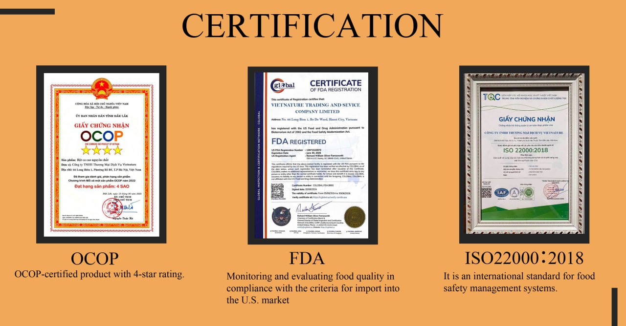 Vietnature Company is a business specializing in supplying and exporting high-quality Vietnamese agricultural products such as coffee, cocoa, rubber, pepper, cashew nuts, and more. With the advantage of abundant raw materials from fertile agricultural regions, we are committed to delivering fresh, safe, and internationally standardized products to our customers.